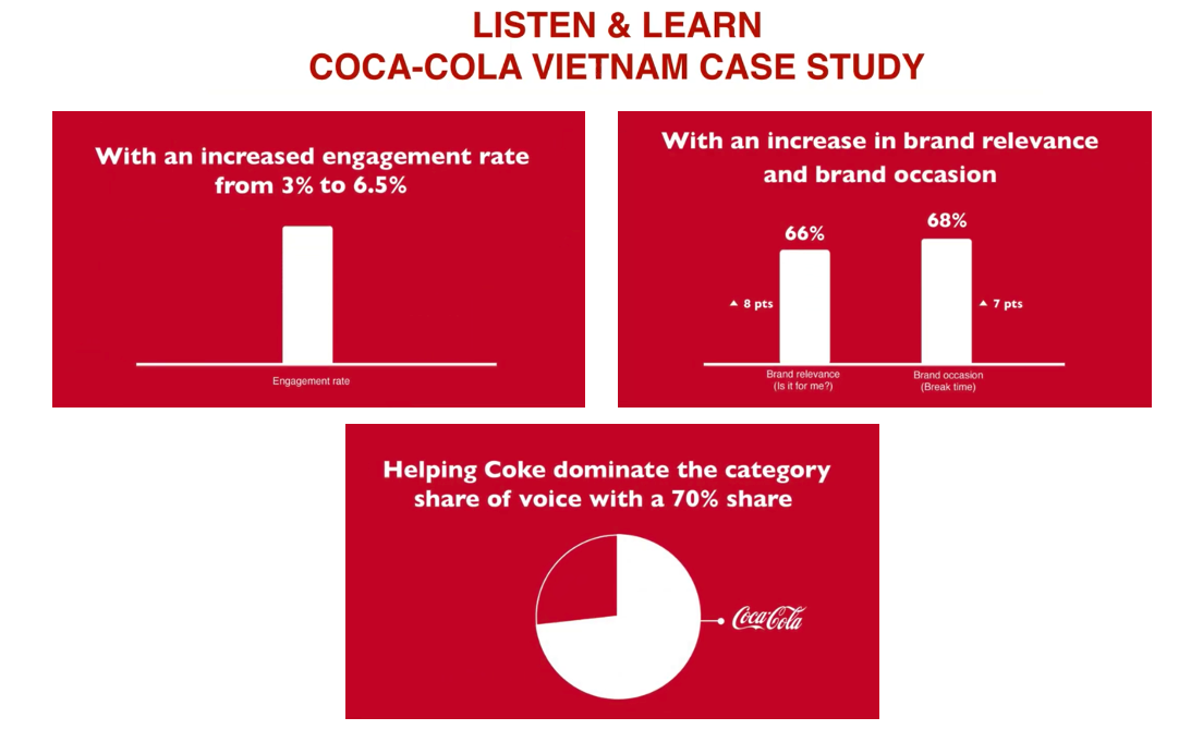 Thu hút sự chú ý, tạo kết nối với người tiêu dùng là một trong những mục tiêu của thương hiệu. Để thực hiện được nhiệm vụ đó thì nội dung của bạn cần phải liên quan/relevant với sự quan tâm của nhóm khách hàng mục tiêu mà vẫn có tính gắn kết với thương hiệu. Coca Cola đã dùng Social Listening để xem trong mỗi ngày đang có xu hướng gì diễn ra, và sẽ xem xét trên từng trend đó để chọn lựa, sản xuất nội dung. Kết quả Coca Cola vào thời điểm đó đã đạt được tỉ lệ tương tác cao nhất so với các thương hiệu FnB khác, giúp thương hiệu tăng được chỉ số về Brand Relevance & Brand Occasion.